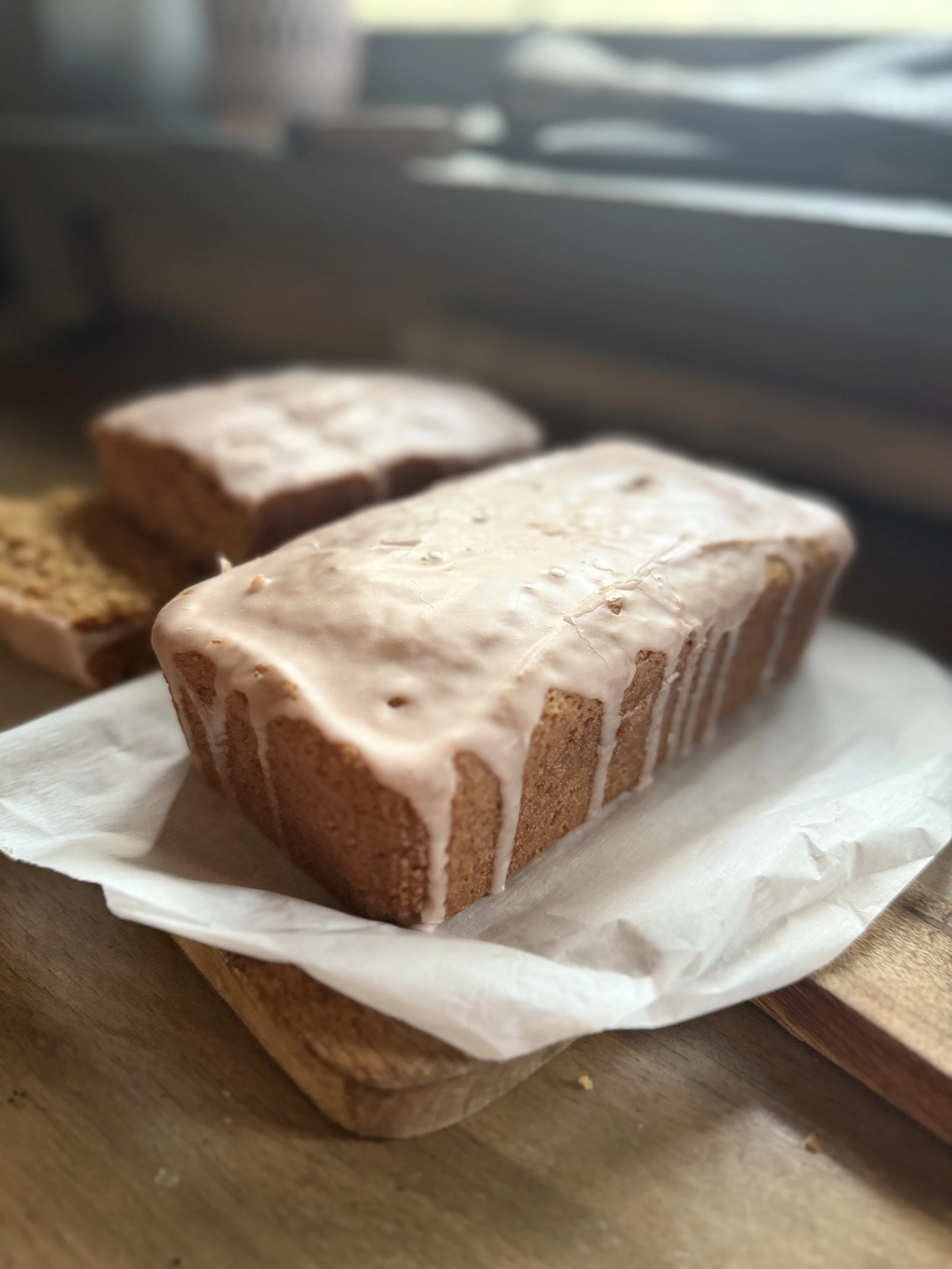 Rich, velvety pound cake infused with classic strawberry cream flavor, topped with a strawberry-vanilla glaze.