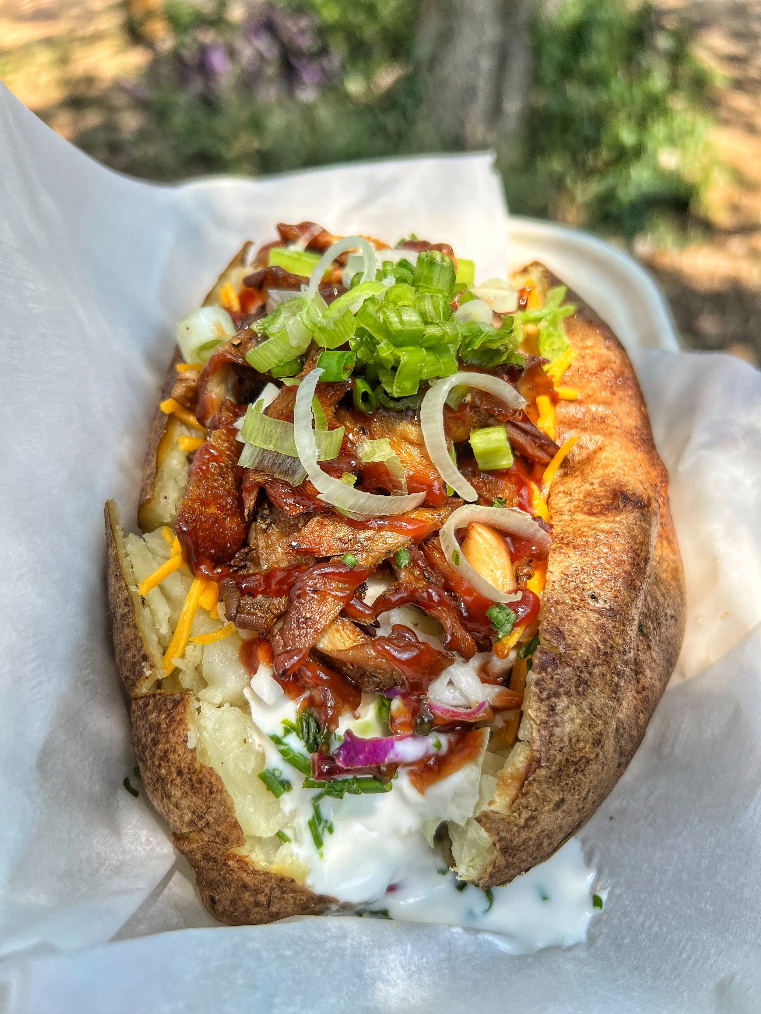 A fluffy, golden-baked potato dripping with plant-based buttery goodness, piled high with smoky marinated BBQ oyster mushroom chick’n, crunchy slaw, tangy house sauce, sour cream, chives, shredded cheddar, and fresh chopped onions. Big flavor. Big energy. Big vibes…